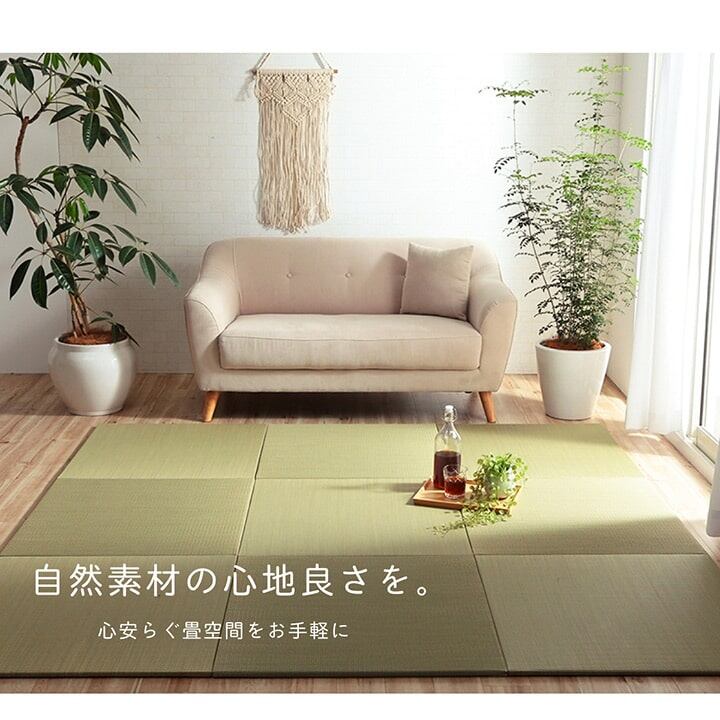フローリングに置くだけ。なつかしい畳の香りと肌ざわりを手軽に楽しめます。い草には空気の自然浄化作用、湿度の調節作用などがあります。また汚れにくく、使用するうちに黄金色に変化し味が出ます。中材は木製ボードタイプ+ポリエチレンで程よいクッション性と重量感があります。※ 掲載写真は表記サイズと異なる場合がございます。※ 画面上のカラーはご使用ブラウザやモニターの設定により、実物とは若干異なる場合がございます。あらかじめご了承の上、ご注文をお願いいたします。
