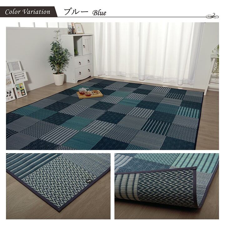 いろいろな織りを組み合わせたパッチワーク風のい草カーペットです。織り方によって違う複数の肌感触をお楽しみ頂けます。落ち着いた色目でモダンな雰囲気に仕上げました。縦糸の本数が多い袋織りという技法で繊細な柄を出しています。折れ曲がりが複雑なので長いイ草を使用しないと切れてしまいます。縦糸が密なので、しっかりとして破れにくいのが特徴です。国産(九州産)のい草を使用しています。一本一本が太く、表皮が厚く繊維がキメ細かいので弾力性があり、耐久性に優れています。い草には空気の自然浄化作用、湿度の調節作用などがあります。また汚れにくく、使用するうちに黄金色に変化し味が出ます。い草に青森ヒバ加工を施しています。(抗菌、防臭効果)