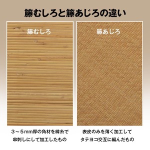 インドネシア原産の5年〜7年育成された籐(ロンティ)を使用しているあじろ商品です。夏を快適に過ごす素材として長年重宝されています。6畳編むのに3週間かかる手の込んだあじろ織り独自の編み模様が高級感と涼感をかもしだすます。冷たくしなやかでとても肌触りがよく、籐だけで編んでいますのでとても長く10年以上使用できる逸品です。使い込むほどに綺麗な飴色に変化していきます。