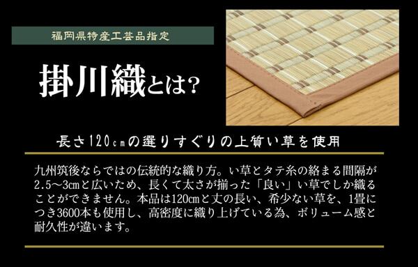 掛川織は九州筑後地方の伝統的な織り方です。大きな目と小さな目に交互に織り込んだ美しく洗練されたモダンなデザインが人気です。また、厳選された良質の太く長いイ草を高密度に織り込んでいますので丈夫で耐久性があり、しかも素足に心地よいクッション性とボリューム感があります。い草には空気の自然浄化作用、湿度の調節作用などがあります。また汚れにくく、使用するうちに黄金色に変化し味が出ます。い草に青森ヒバ加工を施しています。(抗菌、防臭効果)