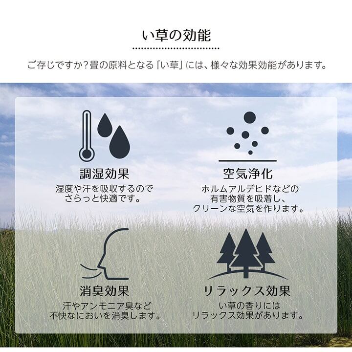 ギャベ柄で明るいデザインに仕上げたい草花ござカーペットです。 和室・洋室どちらにも合わせやすいデザインに仕上げました。和室には裏張り無しの商品、洋室には裏張り有りの商品がお勧めです。天然素材のい草には、お部屋の空気をきれいにする空気清浄効果、お部屋の湿度を調整する調湿効果、汗臭、加齢臭、ペット臭などの嫌な臭いを消臭する消臭効果など優れた機能性があります。 青森県のヒバの木から抽出した「ヒバエッセンス」をメーカー独自の技術で生地表面に加工しました。ヒバエッセンスにはヒノキチオールという、天然物質としては極めて抗菌性の高い成分が含まれています。(無加工品に比べ、抗菌防臭効果があります。)
