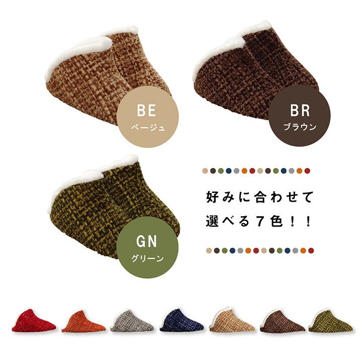 表地は針抜きでボコボコとした凸凹感を出し、なめらかな肌触りの珊瑚マイヤーです。あったかボア仕様で足首まで覆うため暖かく、かかとがないため脱ぎ履きがしやすいタイプです。ご自宅用、来客用、オフィス用など幅広くどのような場面でもご使用いただけます。