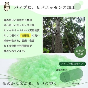ヒバエッセンス練り込みパイプを使用しています。青森県のヒバの木から抽出した「ヒバエッセンス」をメーカー独自の技術でパイプに加工しました。ヒバエッセンスにはヒノキチオールという、天然物質としては極めて抗菌性の高い成分が含まれています。(無加工品に比べ、抗菌・防臭効果があります。)ヒバエッセンスで安らかな森の眠りをご提案します。ご家庭で簡単に洗えます。