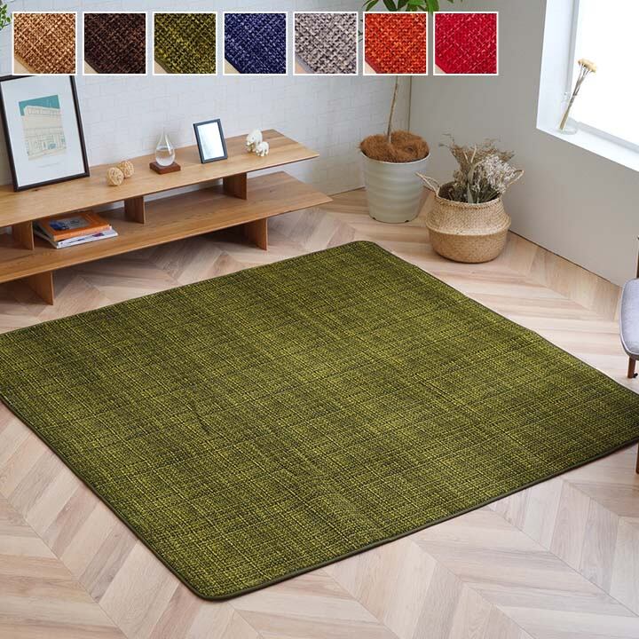 無地系のシンプルデザインです。表地は針抜きでポコポコとした凹凸を出し、なめらかな肌触りの珊瑚マイヤーを使用しています。裏面には滑りにくい加工を施しています。毛足が短いため、お掃除が簡単です。床暖房・ホットカーペット対応です。オールシーズンお使いいただけます。