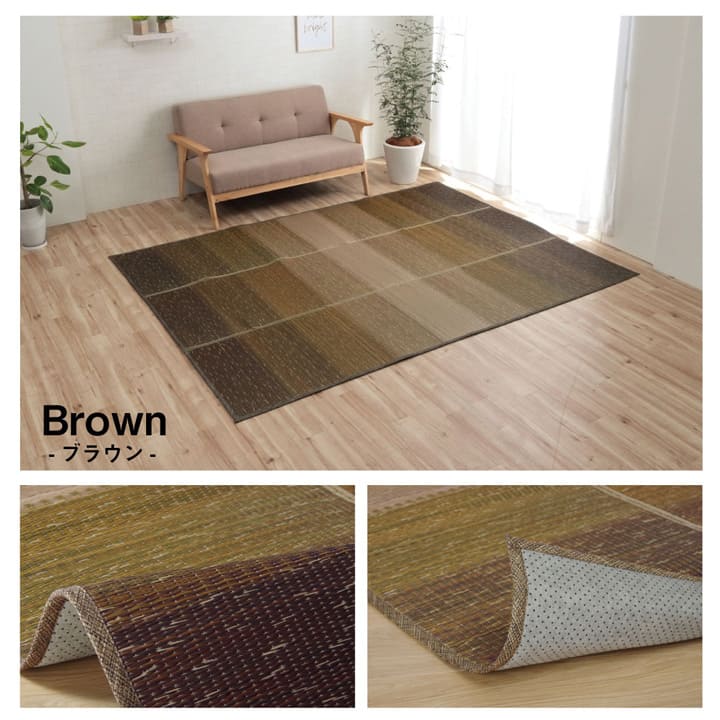 KOBA-GUARDという吹き付け加工をおこなったい草ラグです。KOBA-GUARD加工により制菌・抗菌防臭があります。グラデーションカラーでお部屋の彩と清潔感をプラスしてくれます。裏は滑り止め不織布付きで床を傷つけません。