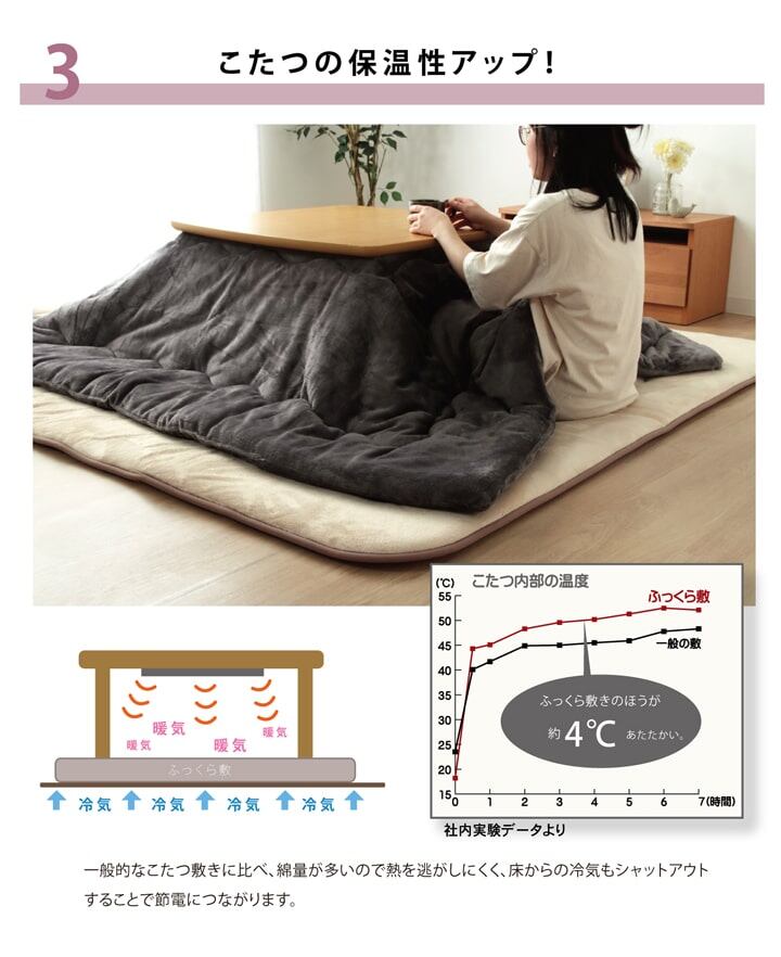 表地には肌触りが良く、耐久性に優れたマイクロファイバーを使用しています。中材にはクッション性にこだわった国産の固綿40mmを使用しています。十分な弾力性があるのでフローリングでのご使用にも最適です。遮音特級LL-30を取得しています。床下への騒音も軽減します。また、こたつと併用するとこたつの熱を床下へ逃しにくくなるので省エネ効果もあります。