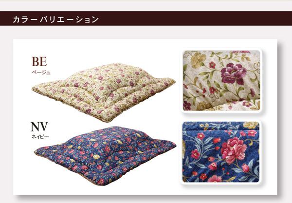 エレガンス調の花柄をあしらった綿素材のこたつ布団です。デザインは国内でプリント工程を行う事で、より繊細・鮮明な柄を出す事が出来ました。日本製のプリントらしい、上質な質感と文様をお楽しみ下さい。肌に触れる裏地にはフランネルと呼ばれる、しっとり柔らかな生地を使用しています。また、布団が体にフィットする様にキルティングをしており(フィットキルト加工)、熱が逃げにくい形に仕上げました。部分暖房のコタツは電気代もおトクです。